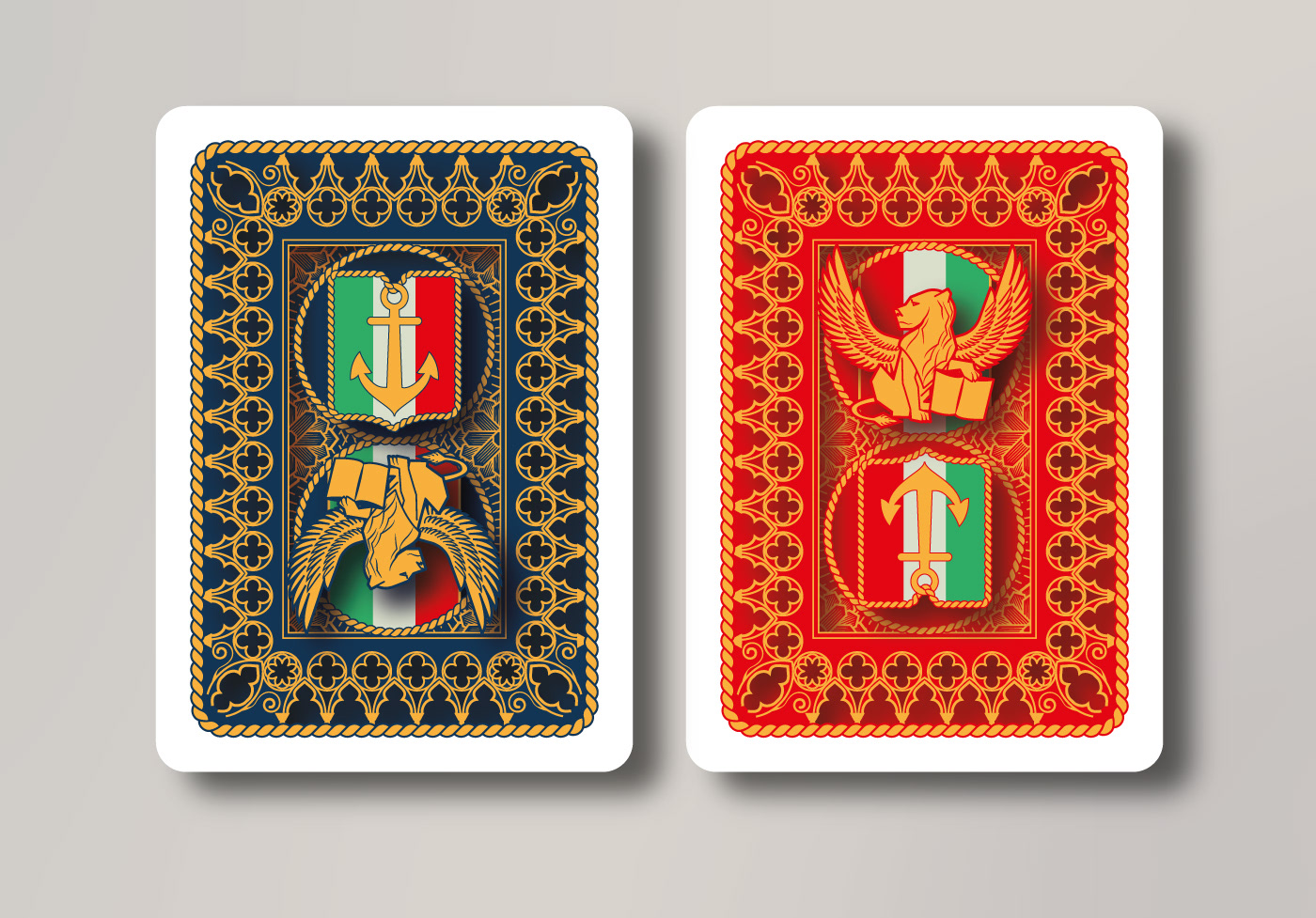 Il dorso, o retro del mazzo di carte, sarà realizzato in tre colorazioni, come i colori dei tre corsi che si susseguono al Navale, ovvero: Verde, Blu e Rosso.